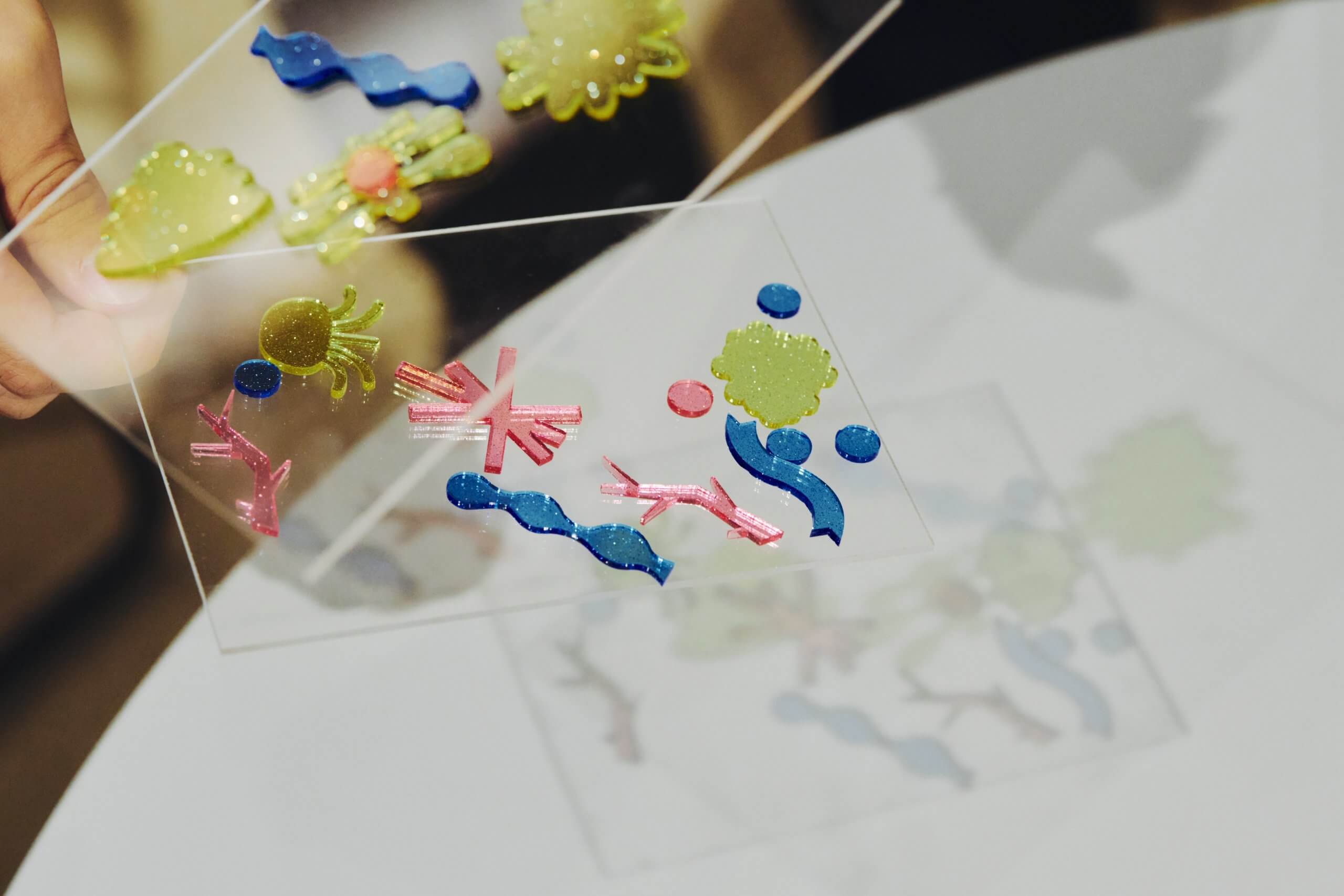 ガチャガチャを回すと、かわいい水中生物のシールが…!たくさん集めてドリンクのコップに貼り、自分だけの水族館をつくろう。