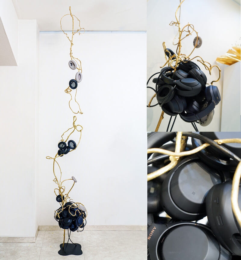 オリジナルシリーズ「ハナテク」より、“ヘッドホン”を主役にした新作。草月流の技法「分解して再構成」に着想を得て、普段意識されない(であろう)イヤーパットやバンドなどのパーツをメインの素材として再構築している。FabCafeの窓際に、プロダクトが持つ造形美と違和感を忍び込ませる。