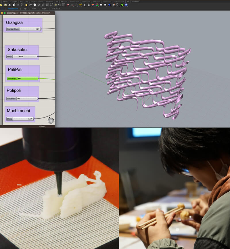 誰もが想像した食感を実装できる世界を実現するデザインツール、食感ジェネレーター。内部構造や口内崩壊の緻密な計算技術を基盤に、パラメータ操作で食感を構築するアプリを開発。3Dプリンターで造形することで、未知の食体験を実現する。技術開発のプロセスはオープンコラボレーションを重要視し、コミュニティドリブンで多様な人々を巻き込みながら進化を続けている。
