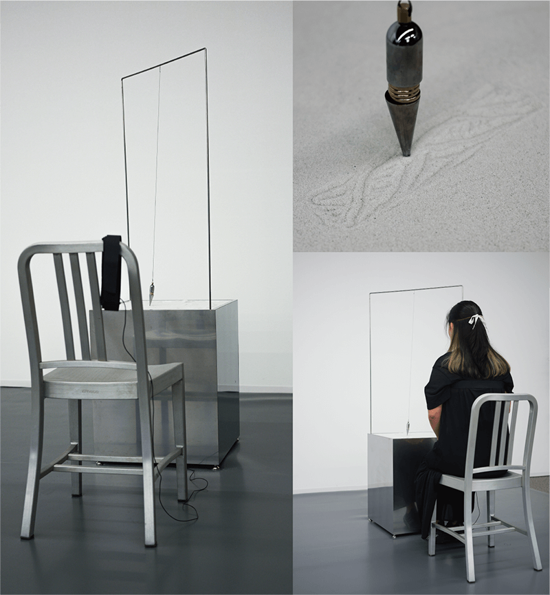 装着した人の呼吸に合わせて振り子が動き、そのひとそのひとに合わせた砂絵が生まれていく装置。