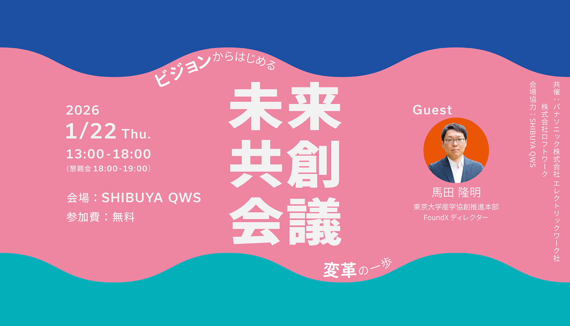 2026年1月22日(木)SHIBUYA QWSにて開催する「未来共創会議 - ビジョンからはじめる変革の一歩 -」。馬田隆明氏の講演や、ワークショップを通じ、未来を描き共創の糸口を見つける一日です。