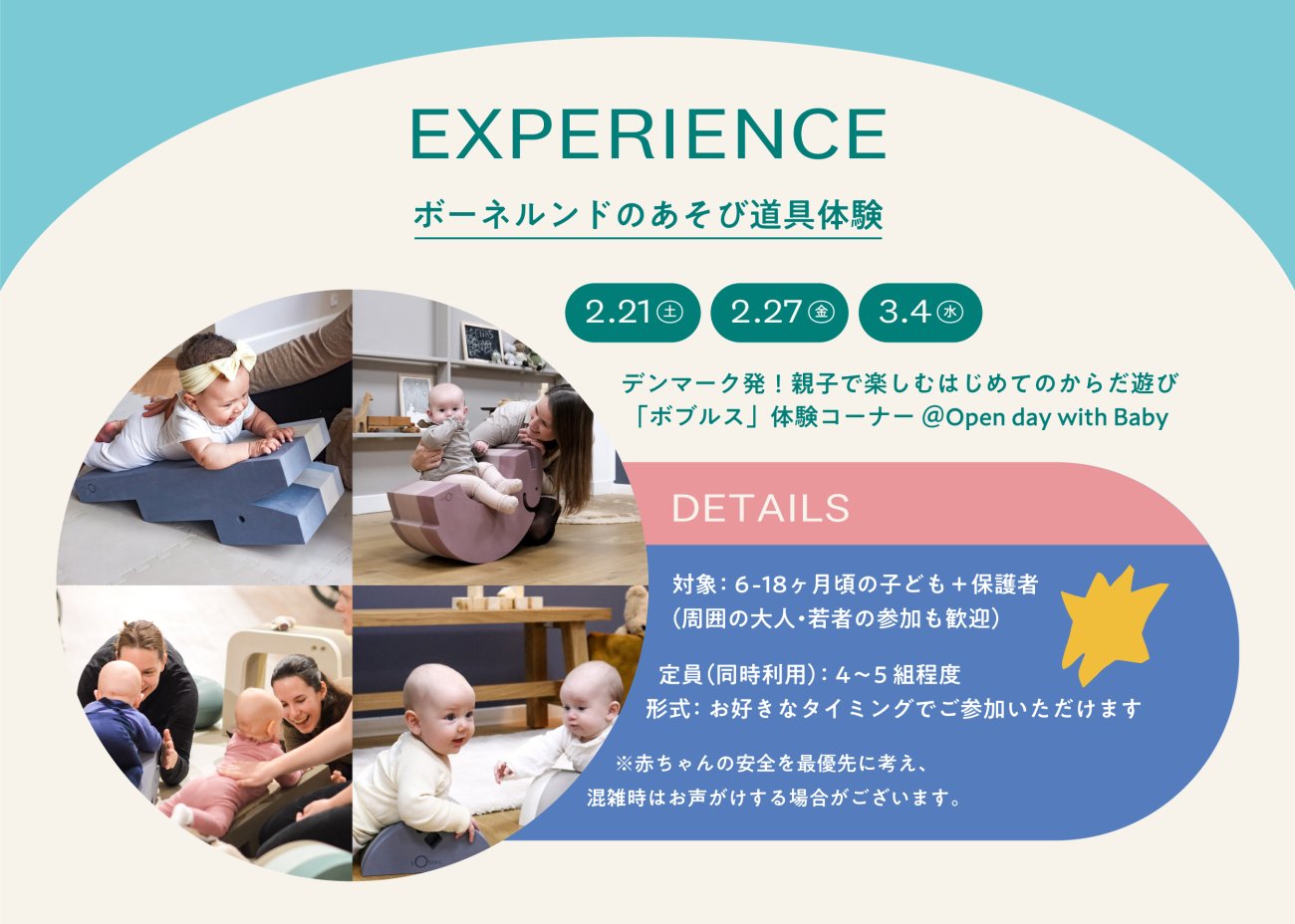 6ヶ月の赤ちゃんから使える「ボブルス」は、置き方や乗り方によって、成長に必要なさまざまな体の動きを引き出せるあそび道具です。デンマーク本国では、ボブルスを用いたプログラム「タンブリング・タイム」が開催されており、人口約 500 万人の国で毎年 2,000 人もの赤ちゃんが参加しています。