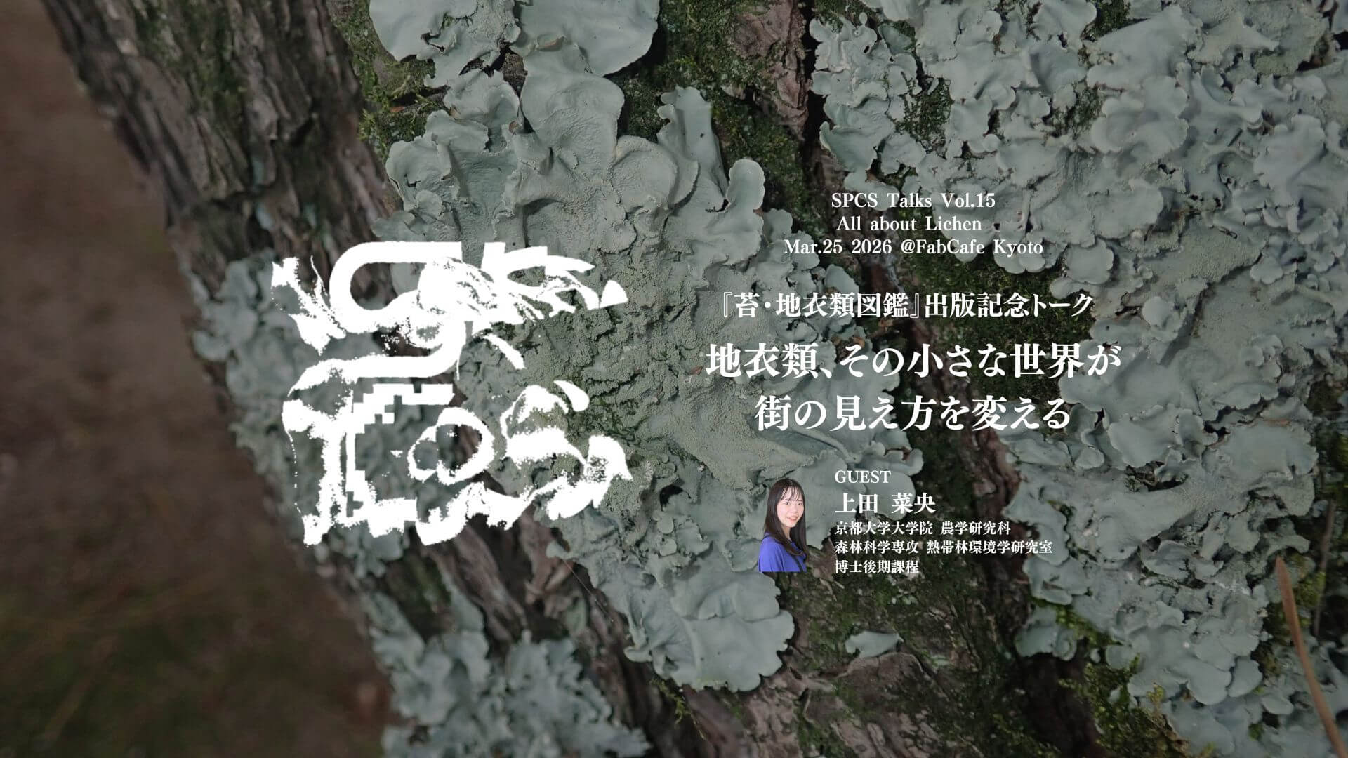 このたびFabCafe Kyotoでは、日本文芸社より刊行された『苔・地衣類図鑑』の出版を記念して、地衣類編を担当した著者・上田菜央さん(京都大学大学院 農学研究科 森林科学専攻 熱帯林環境学研究室 博士後期課程)をお招きし、トークイベントを開催します。地衣類への偏愛を全力で語っていただく、なかなかお目にかかれない夜です。