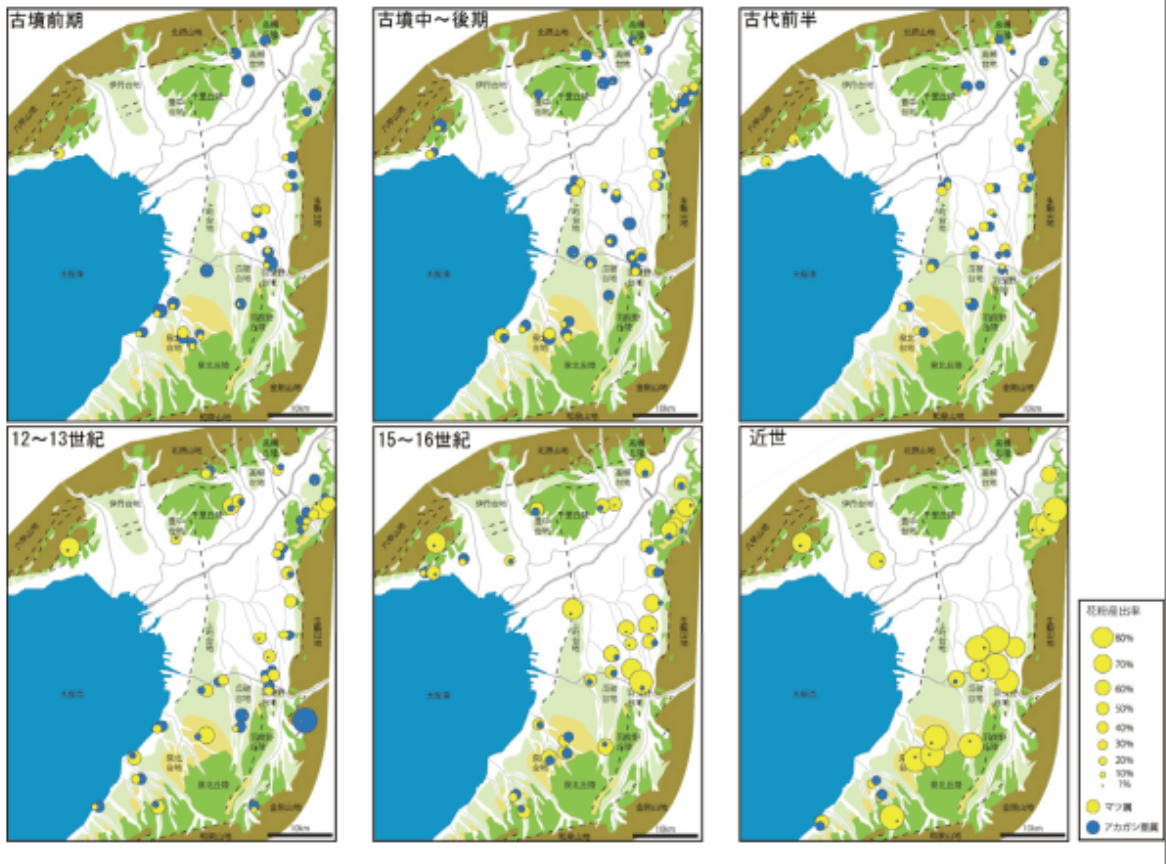 豊臣期から徳川期にかけては、大坂城の築城に伴う大規模な造成により地形そのものが大きく改変され、森之宮も大坂城の惣構の一部に組み込まれます。こうした開発によって、この地域では森林植生はほとんど見られなくなったと考えられます。また、耕作地ではワタやアブラナなどの商品作物が栽培されていたことが、花粉や種実遺体の出土から推定されています。