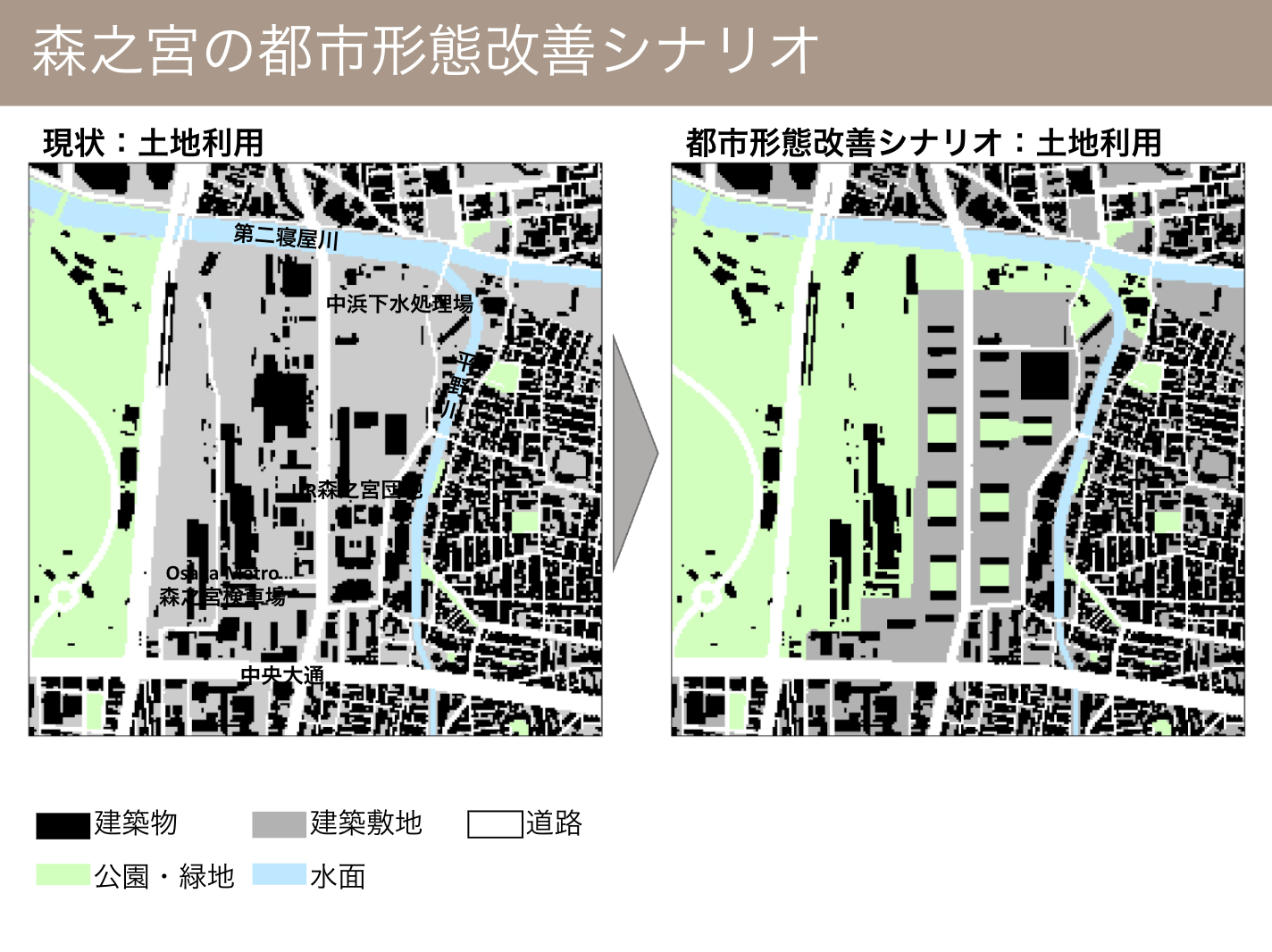 松尾さんは学生とともに「都市形態改善シナリオ」という土地利用プランを試作しました。第二寝屋川から検車場跡まで緑地を連ねて“風の回廊”をつくること、河川沿いと線路跡に連続した公園帯を設けること、団地配置を見直して風の“抜け”を増やすこと、という案です。そのプランをもとに気象の再シミュレーションを行った結果、大阪城公園の冷気が東へ広がり、川筋の低温帯も厚みを増し、団地間では風が通りやすくなり、体感の改善傾向が見えました。“点の緑”を“線や面の緑”へとつなぐことで、確かにエリアの快適指数が上がることが可視化されていました。