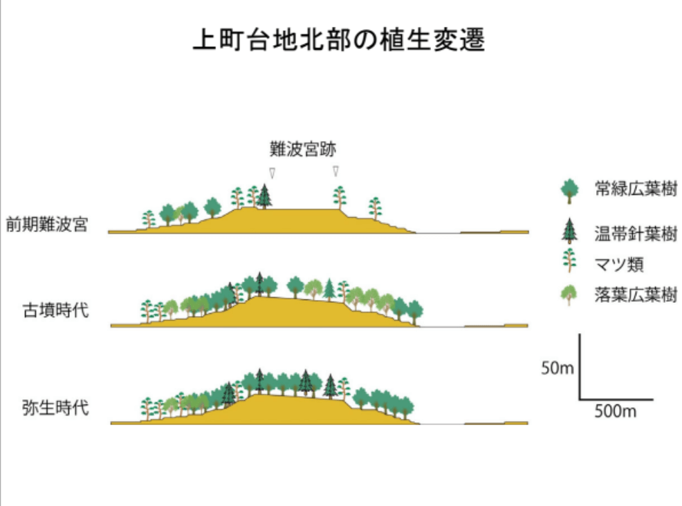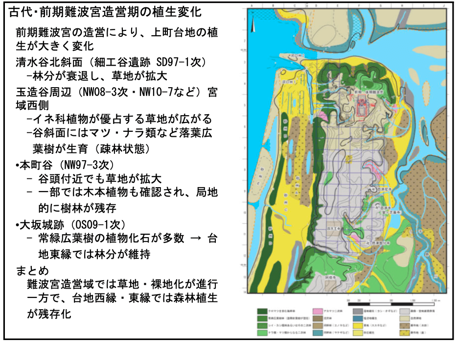 難波宮の造営によって、上町台地北部の景観は大きく変化しました。大規模な開発によって宮域周辺の植生は大きく損なわれ、裸地が広がり、その周囲では二次林化が進行します。一方で、宮域から離れた台地斜面の下部などには、常緑広葉樹や落葉広葉樹が混ざり合う林分が残されていたと考えられています。また、低地にはヨシなどが生い茂る湿地が広がっていたことも推定されます。こうした状況から、古代の植生は人々の営みによって場所ごとに異なる姿を見せる、いわば“モザイク状”の景観であったといえるでしょう。