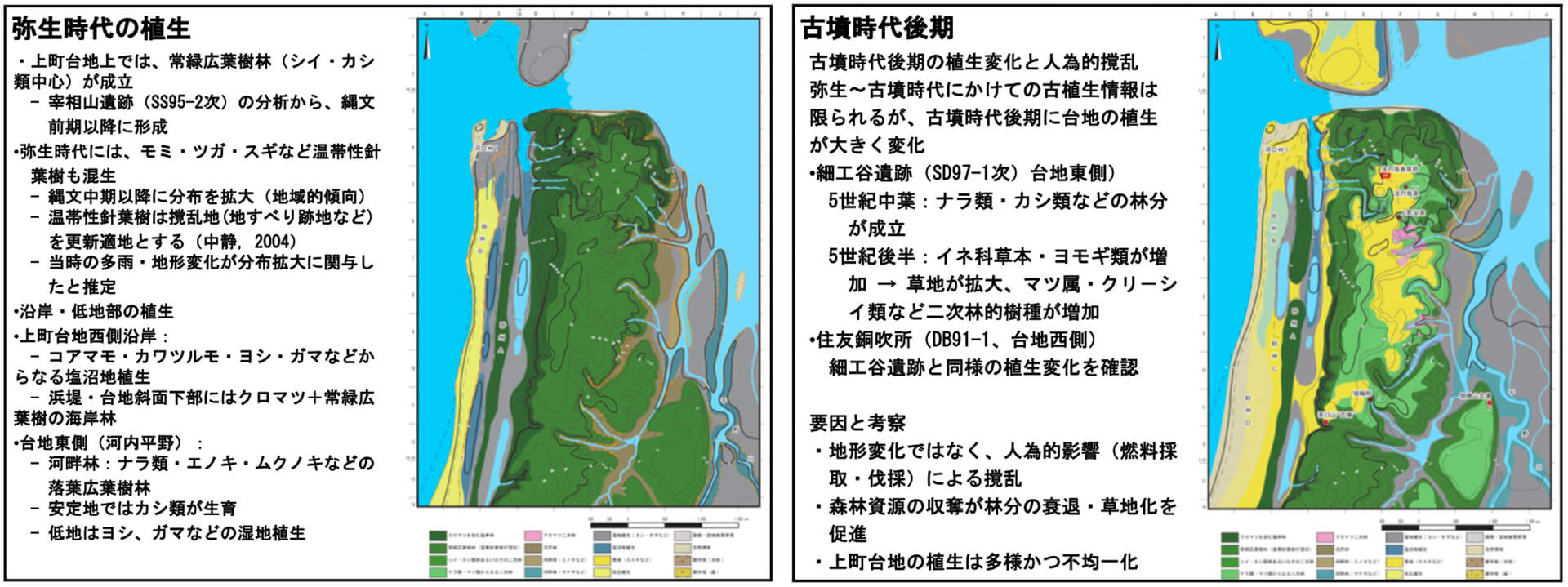 古墳時代に入ると、伐採や利用など人間の活動による影響で植生が変化し、二次林(人の手が加わることで生まれた森林)が広がっていきました。さらに、台地西側の浜堤(砂の高まり)には、クロマツを中心とした海岸林が成立していたことも確認されています。