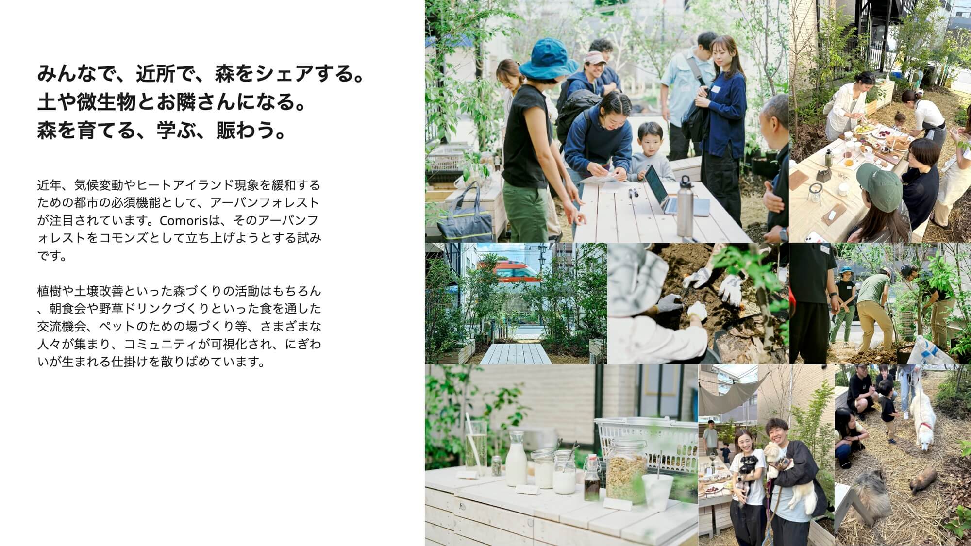 「Comoris(コモリス)」は、都市の小さな空き地を“みんなで育てる森”としてシェアするサービスです。デザインリサーチラボ「ACTANT FOREST」の南部隆一さんと小田木確郎さん、そして今回登壇したまちづくりデザインスタジオ「NEWPARK」の渡辺英暁さんの三者によって設立されたComoris DAO合同会社によって運営されています。会員が土づくりから植樹・維持管理まで主体的に関わり、「都市に森を増やす」というミッションを、人の行動変容から実現しようとするプロジェクトです。