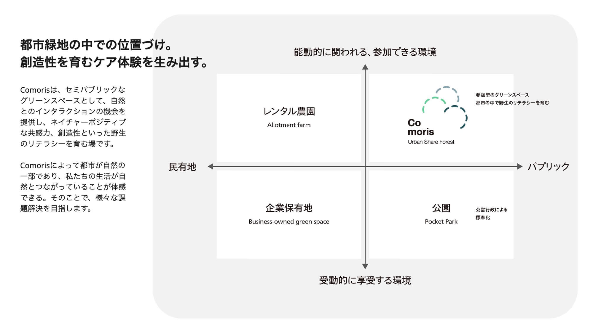 また、朝に森の中で大きなテーブルを囲む「森の朝食会」や夕方に行う「森のお茶会」では、会員、地域住民、SNSを見て訪れた人がゆるやかに交わります。森で育ったハーブや野草を味わいながら過ごす時間が、小さな緑地を“セミパブリックな場”として開き、人と自然、そして人と人の関係を静かに再編していきます。都市の余白に森を挿入するだけでなく、その森が多様な主体をつなぐエコシステムとして機能しはじめている点こそ、Comorisの最も重要な価値であるといえるでしょう。