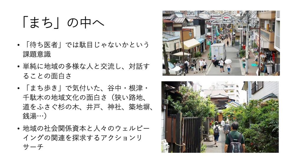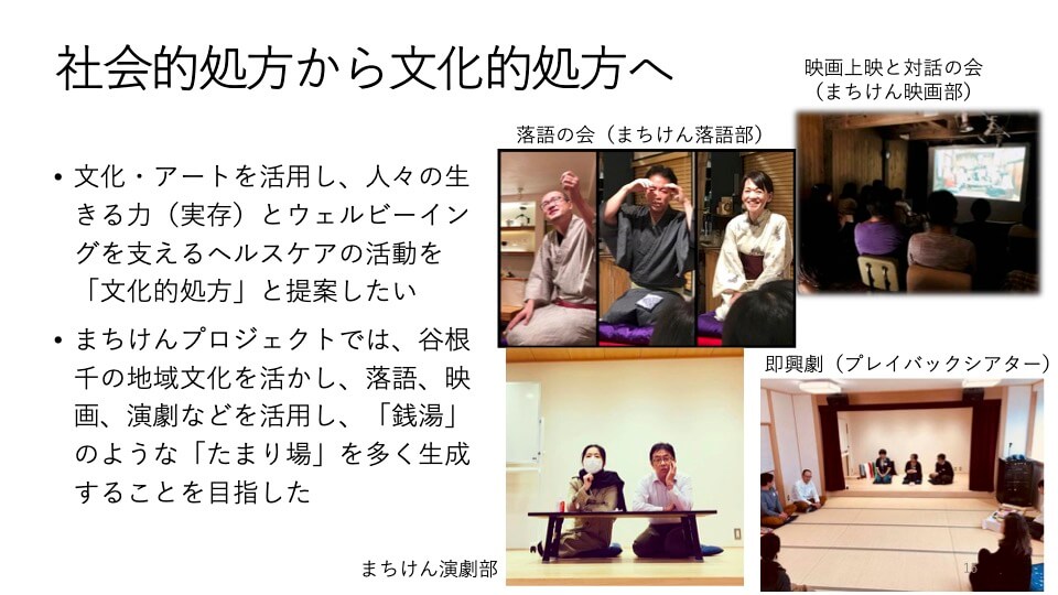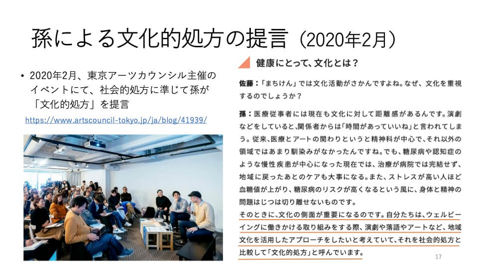 その背景には、英国で進む「クリエイティブヘルス」や、医療と人文学を結ぶ「ヘルスヒューマニティ」の潮流があります。孫さんはそこに、生活・文化・健康がゆるやかにつながるウェルビーイングのかたち=地域医療の未来の姿、を見ています。