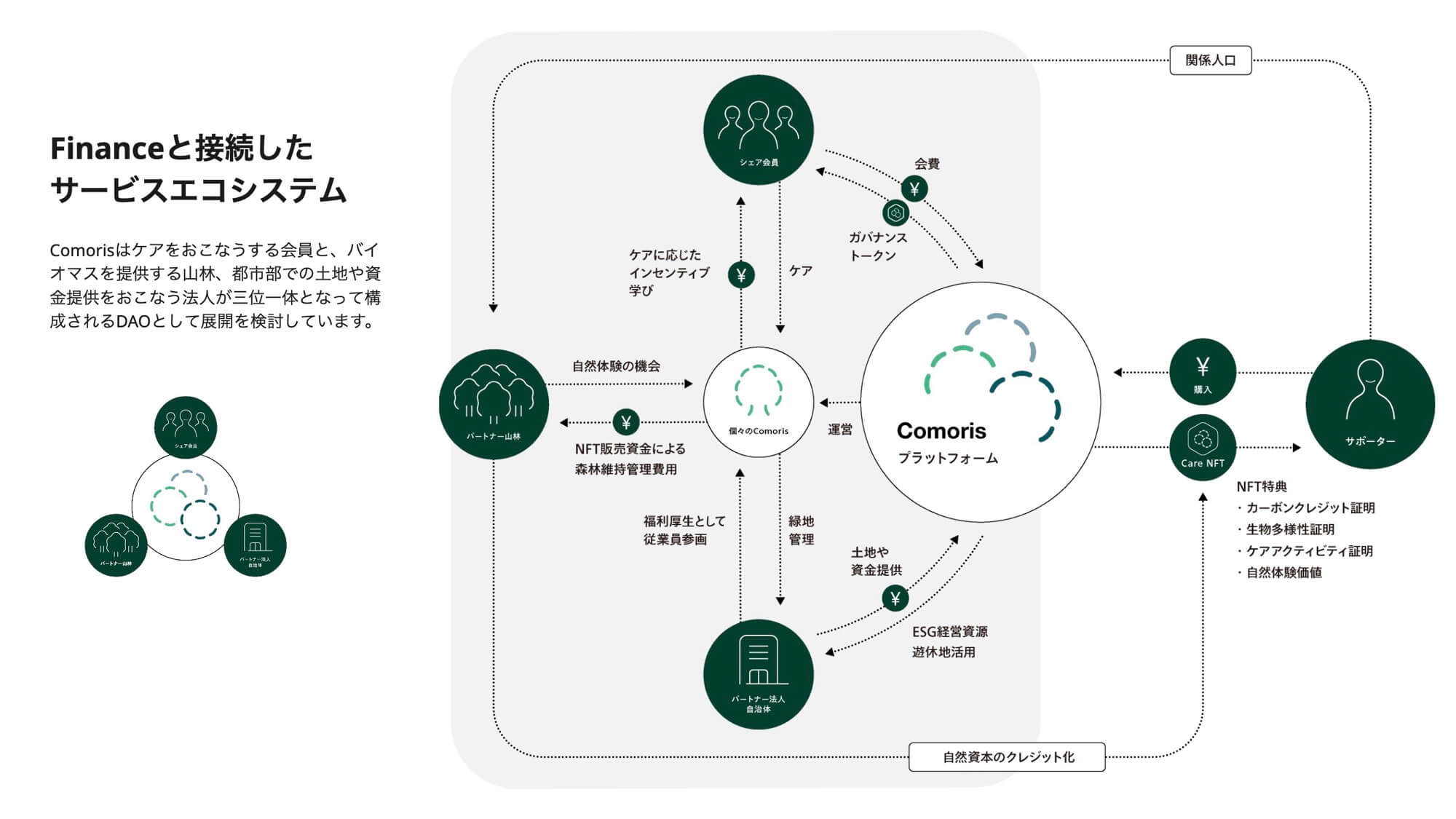 商店会や造園業者、大学、企業など多様な主体が出入りし、森を通じて異なるコミュニティが自然につながっていきます。また、生物多様性への貢献度を可視化したNFTを活用し、都市の森と山間地域の里山保全を資金循環でつなぐ仕組みも構築中です。