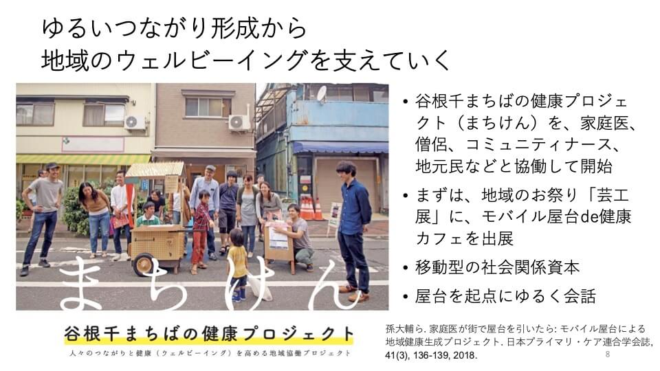 「医療の入口は病院じゃなくていい」という孫さんの言葉どおり、孫さんの実践は、医療が“困ったときに行く場所”から、“ふだんの暮らしの延長にある関係性”へ変わっていくきっかけをつくっています。カフェ、銭湯、屋台、映画上映会など、いずれも地域住民が参加しやすく、医療者との境界が曖昧になる場所です。そこに生まれる緩やかなつながりが、健康課題の早期発見や、日常的な相互扶助を自然に支えていきます。