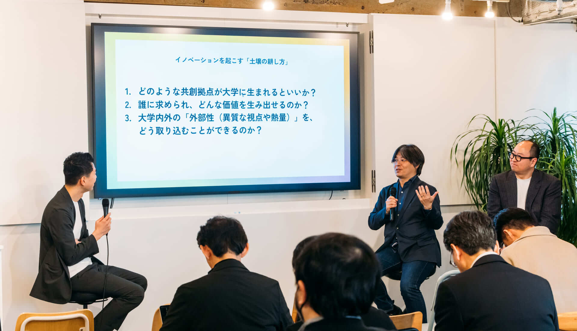 本イベントは、大学の未来につながる知恵と戦術を探るべく、エコシステム論の第一人者である辻本将晴先生と、共創拠点「SHIBUYA QWS」を立ち上げた野村幸雄さんを迎え、議論を交わしました。本レポートでは、イベントのダイジェストと見どころをご紹介します。