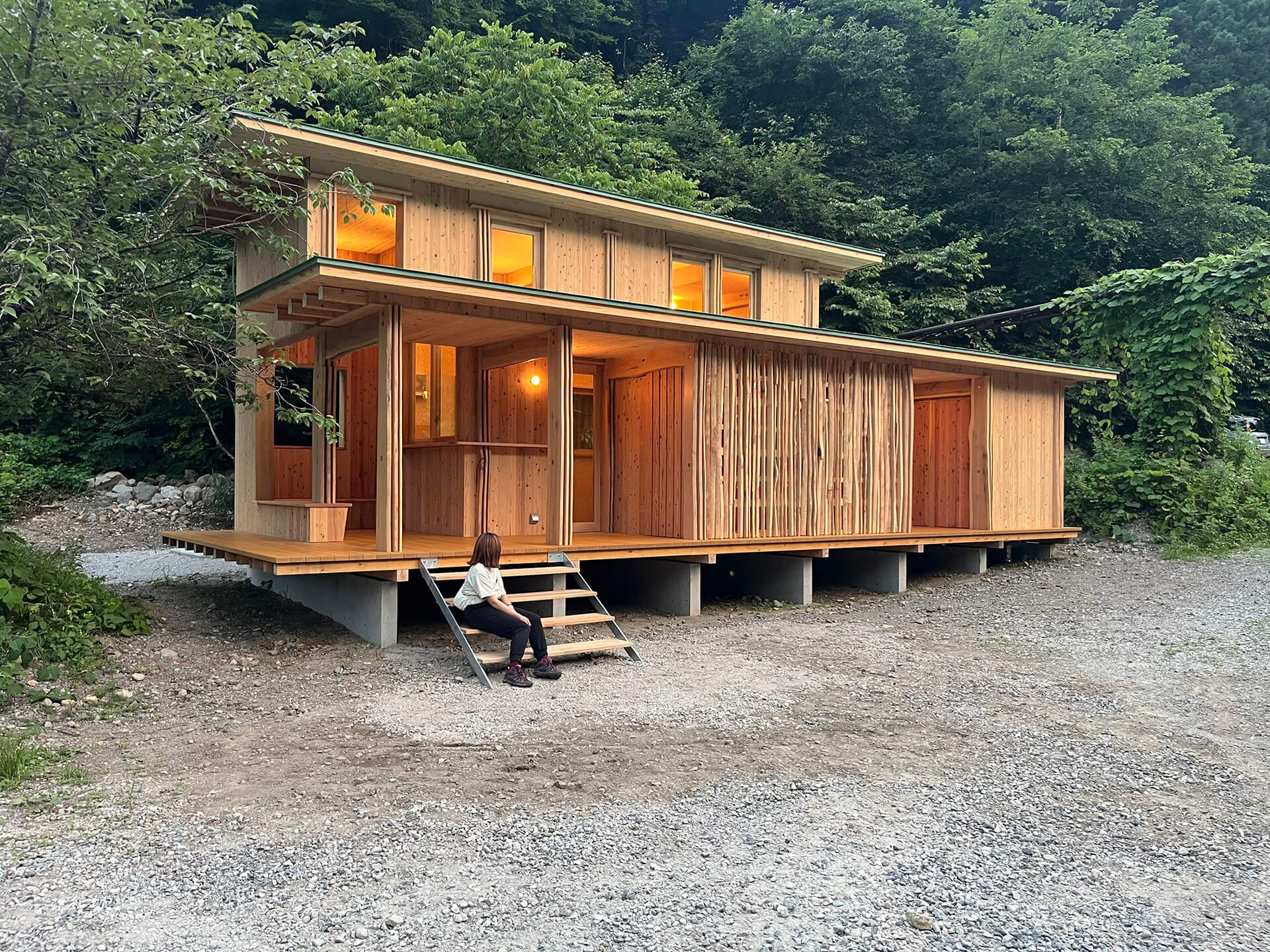 岩岡さんの運転で、次に向かったのは森の端オフィスから車で40分ほどの奥飛騨温泉のすぐそばにある、「道具番屋」という聞き慣れない名前の木造建築。建物のすぐ裏にはこんもりとした森が見えます。この森の所有者で、岐阜の駅前でテナントビル事業を営む新岐阜興業株式会社の代表・大橋司さんは笑顔で迎えてくれました。