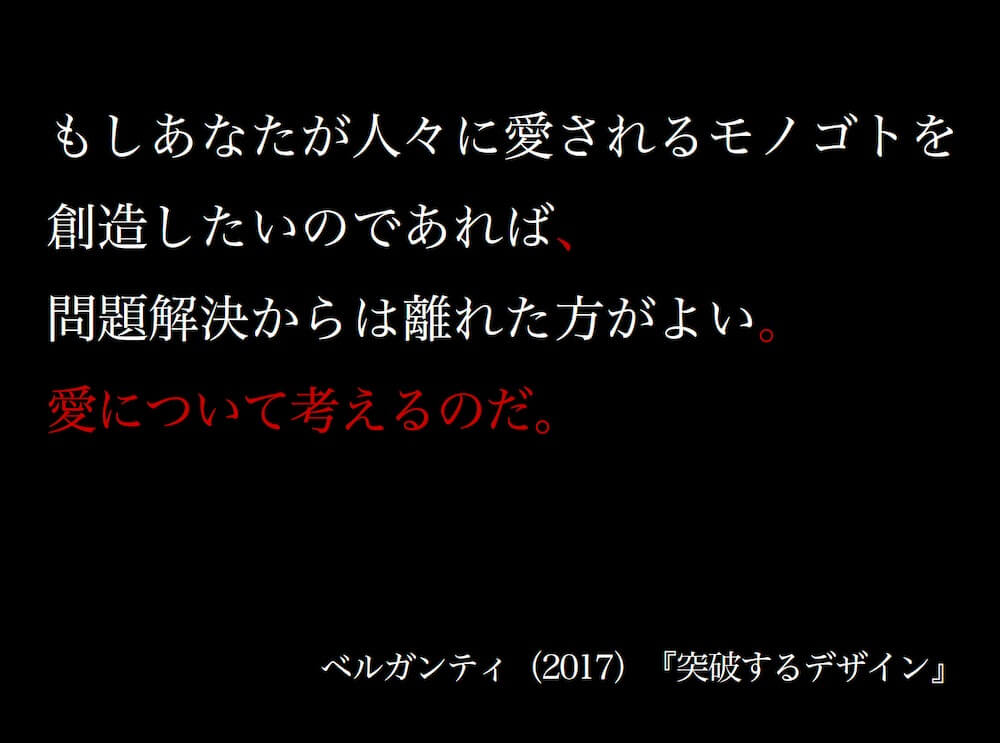 八重樫さんは、「意味のイノベーション(デザインドリブンイノベーション)」で知られるロベルト・ベルガンティ氏の「人々に愛されるモノゴトを創造したいのであれば、問題解決からは離れた方がよい。愛について考えるのだ。」ということばを引用。