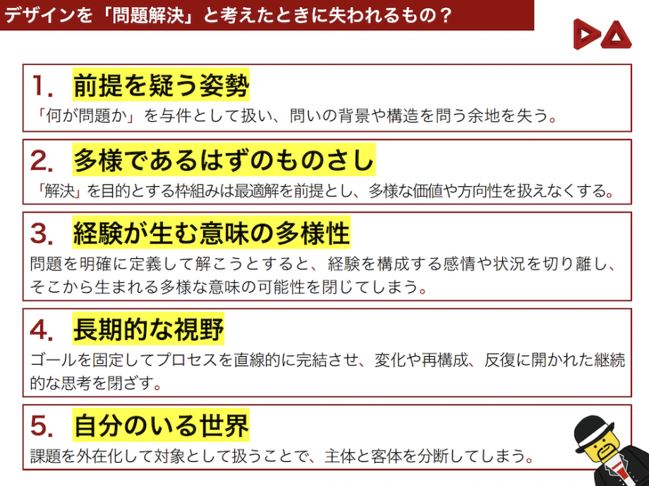 デザインを単に「問題解決」のための手法として扱ってしまうと、私たちは重要なことを見失ってしまう、と八重樫さんは指摘します。