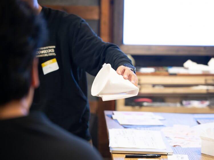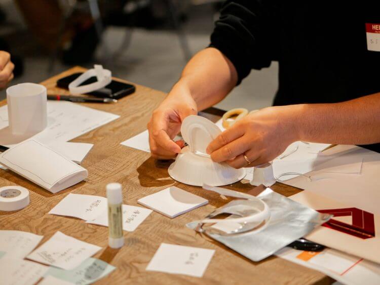 トークに続いて、参加者は、「始められない・続かない健康習慣」という共通のテーマに対し、「プロトタイピング」のワークショップに取り組みました。ワークショップの核心は、「うまくいかない理由」を深掘りし、「人の行動を変える」ための問いを課題の出発点とすること。そして、紙やハサミ、色紙などの身近な素材のみを使い、雑に(ラフに)制作するプロトタイピングを通じて、体験の核を具現化しました。