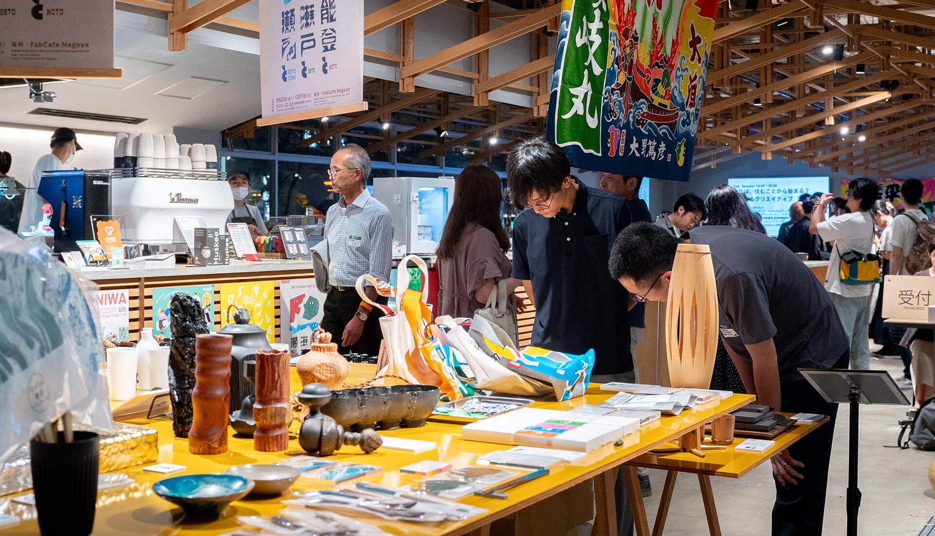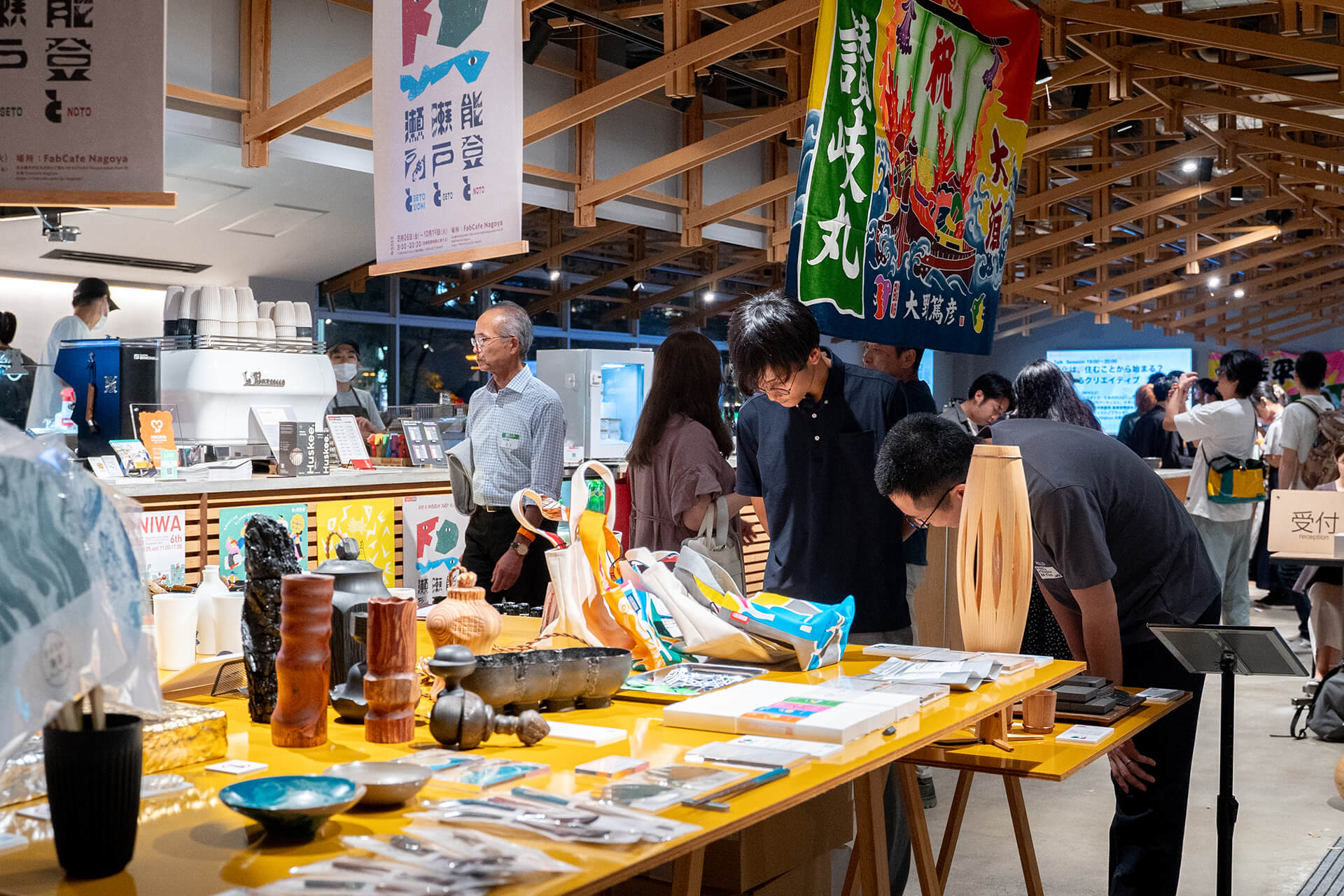 2025年9月26日に、展示の幕開けを祝うオープニングイベント がFabCafe Nagoyaで開かれました。能登・瀬戸・瀬戸内の作り手や関係者が集まり、作品や道具を手に取り、会話の温度を通して<風土の違い>と<共通点>を体験しました。