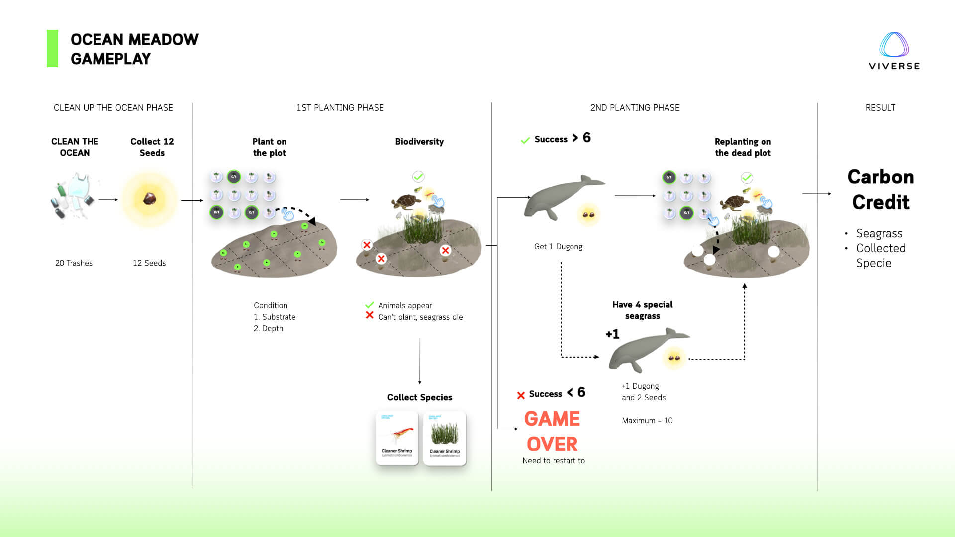 そのうえで、プレイヤーは汚れた場所を掃除し、適した場所に種を植え、生態系の回復を進めていきます。海草が育つと、それを餌やすみかにする魚、ウミガメ、貝類などが戻ってきます。さらに、海草を好むジュゴンも現れます。ジュゴンは、現実の自然界では排泄を通して種を広げる自然の庭師のような役割を果たしており、ゲーム内でもボーナスの種を与えてくれる存在として設計されています。人が手を入れることで自然が応え、自然の回復が次の再生を助ける。この循環が、Ocean Meadowの体験の核になっています。