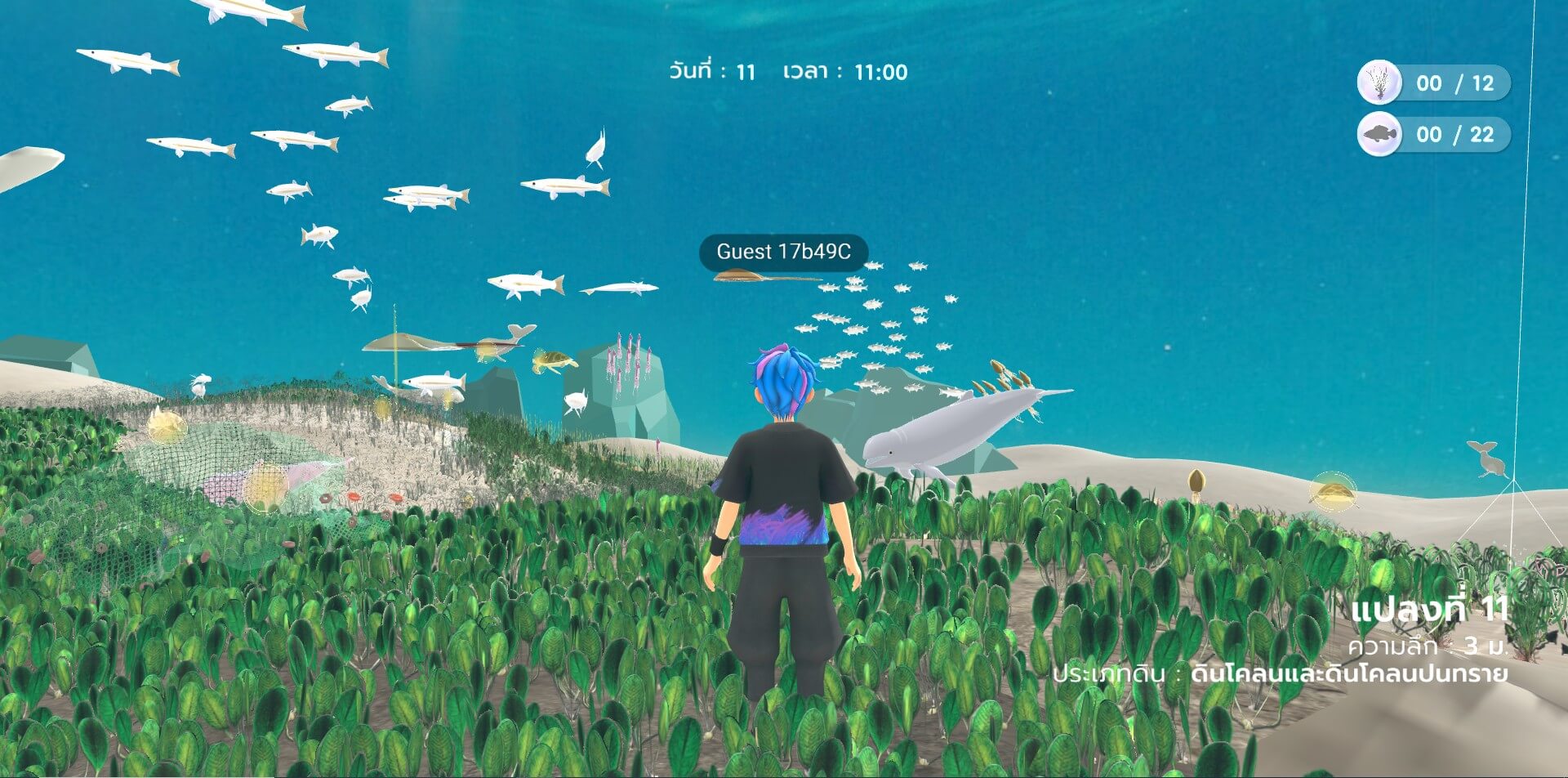 Ocean Meadowの海の風景は、空想だけでつくられたものではありません。タイ沿岸の海に関する実際の研究をもとに設計されており、タイ・ブラパ大学の海洋科学研究所による知見や、タイ南部のソンクラー王子大学で環境マネジメントを専門とするSunitee Sunitok氏との連携が生かされています。単なる海っぽいゲームではなく、地域の環境を学ぶための解像度を備えた世界として組み立てられているのです。