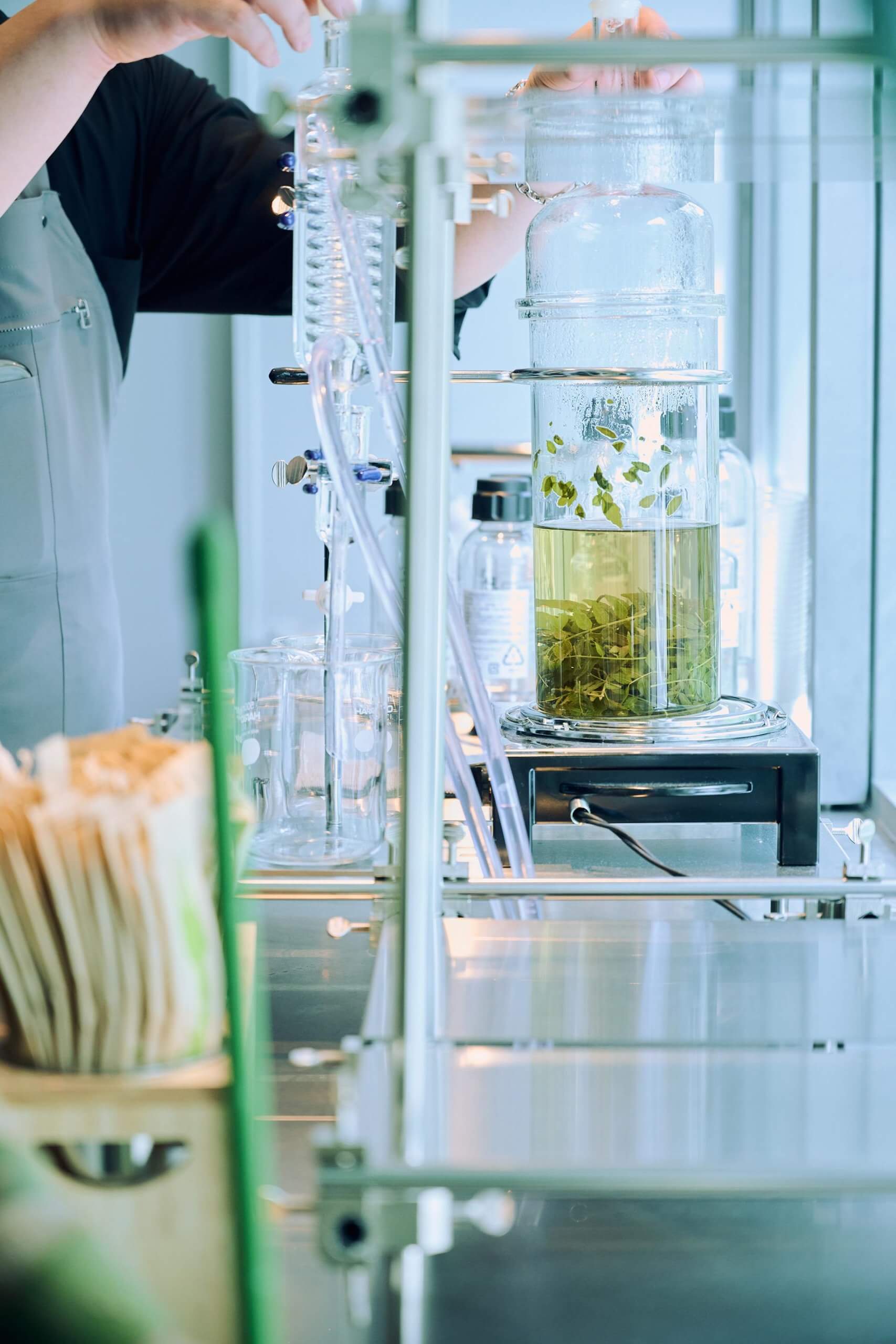その工程は、まるで理科の実験のようです。水の温度が1〜2度違うだけで香り表情が変わり、抽出時間によって香りの立ち方も微妙に異なります。蒸留した液体は、最初の一滴と最後の一滴で濃度も香りも違う。福田は、それらをブレンドして最適なバランスを探りながら、ドリンクの設計を行っています。