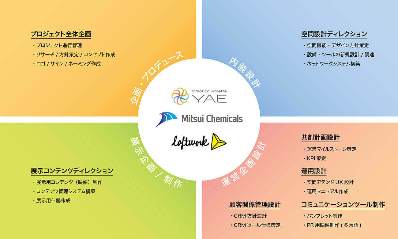 空間プロジェクトは内装家具といったハード面のみに議論やリソースが集中してしまい、結果的に活用率の低い「ハコ」が出来上がるケースも少なくありません。三井化学の共創を促進する新拠点「Creation Palette YAE®」立ち上げプロジェクトでは、なぜ・誰と・どう共創するのかといった方針策定を経て、一貫したコンセプトに基づいたハード・ソフト両面の設計・実装が進められました。