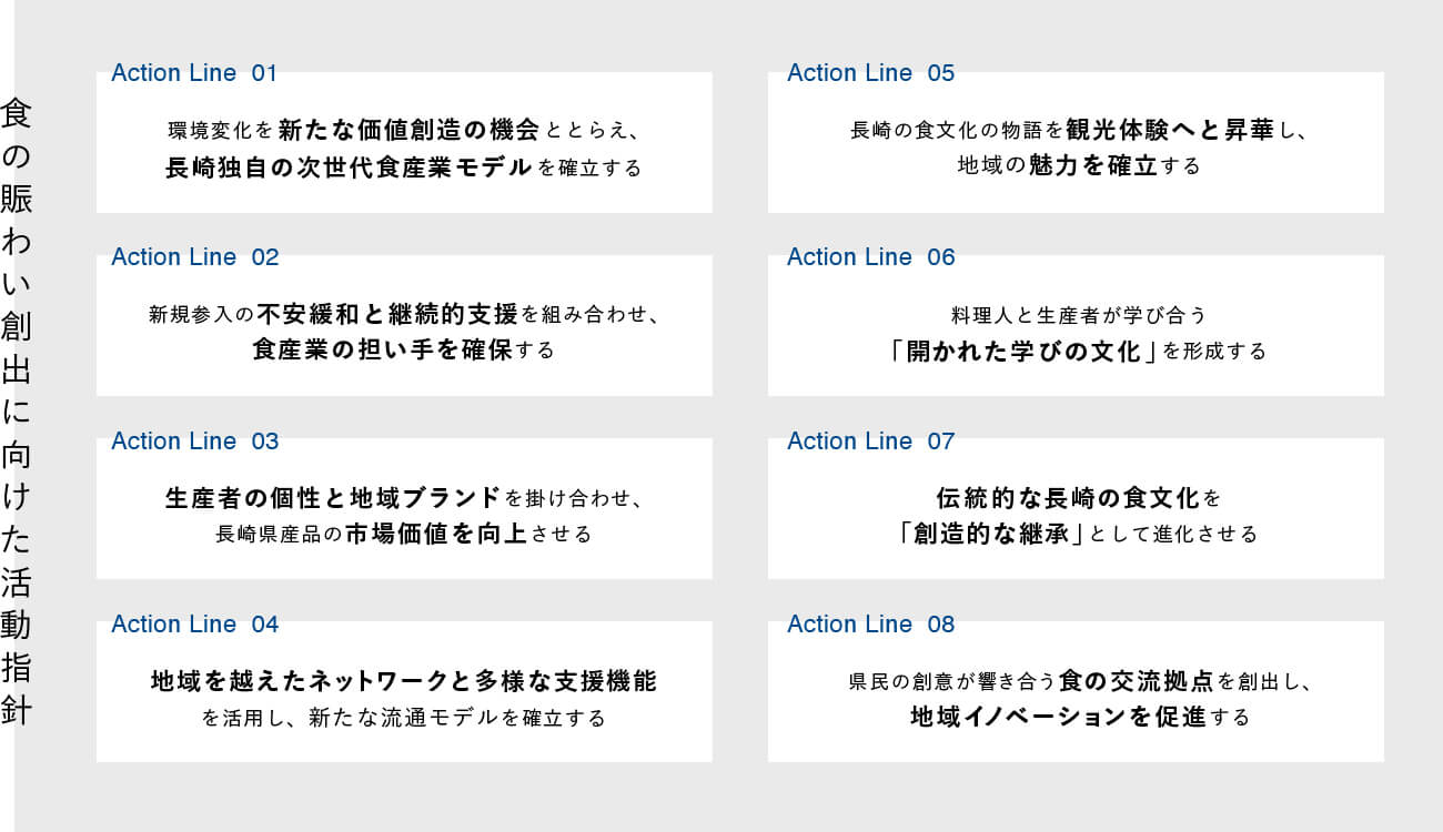 リサーチから浮かび上がったのは、食の賑わいは個別の施策や拠点整備だけで成立するものではなく、人材育成、ブランド化、流通支援、文化継承、交流の場づくりといった要素が相互に関係し合う構造を育てる必要があるという認識でした。これらの洞察は、最終的に提案された8つの活動指針(Action Line)の基盤となっています。