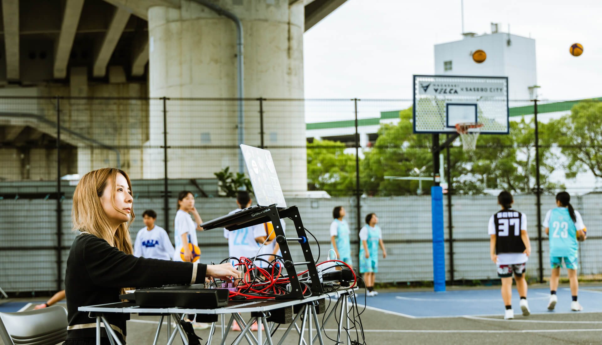 会場となったのは、日本と米国の敷地が半分ずつ混ざり合っている象徴的な場所であり、ストリートカルチャーの拠点としても知られるミニッツパークに隣接するスケートボードパーク、3on3コート(佐世保公園)。当日は3on3のバスケットボール大会が開催されており、ストリートスポーツの熱気とともに演奏が行われました。作家の解釈によって生まれた「佐世保のまちの音からうまれた作品」が、実際に佐世保の日常のなかで響いていく特別な時間となりました。