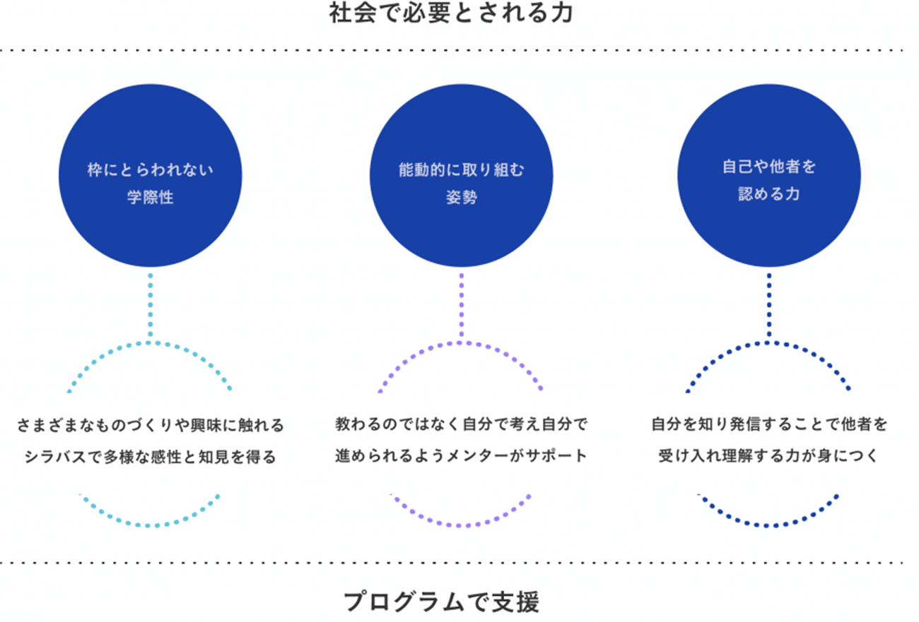 プログラムを通じて、枠にとらわれない「学際性」、自ら考える「能動的に取り組む姿勢」、自分を知り他者を受け入れる「自己や他者を認める心」といった、未来を生き抜くための力を身につけていきます。