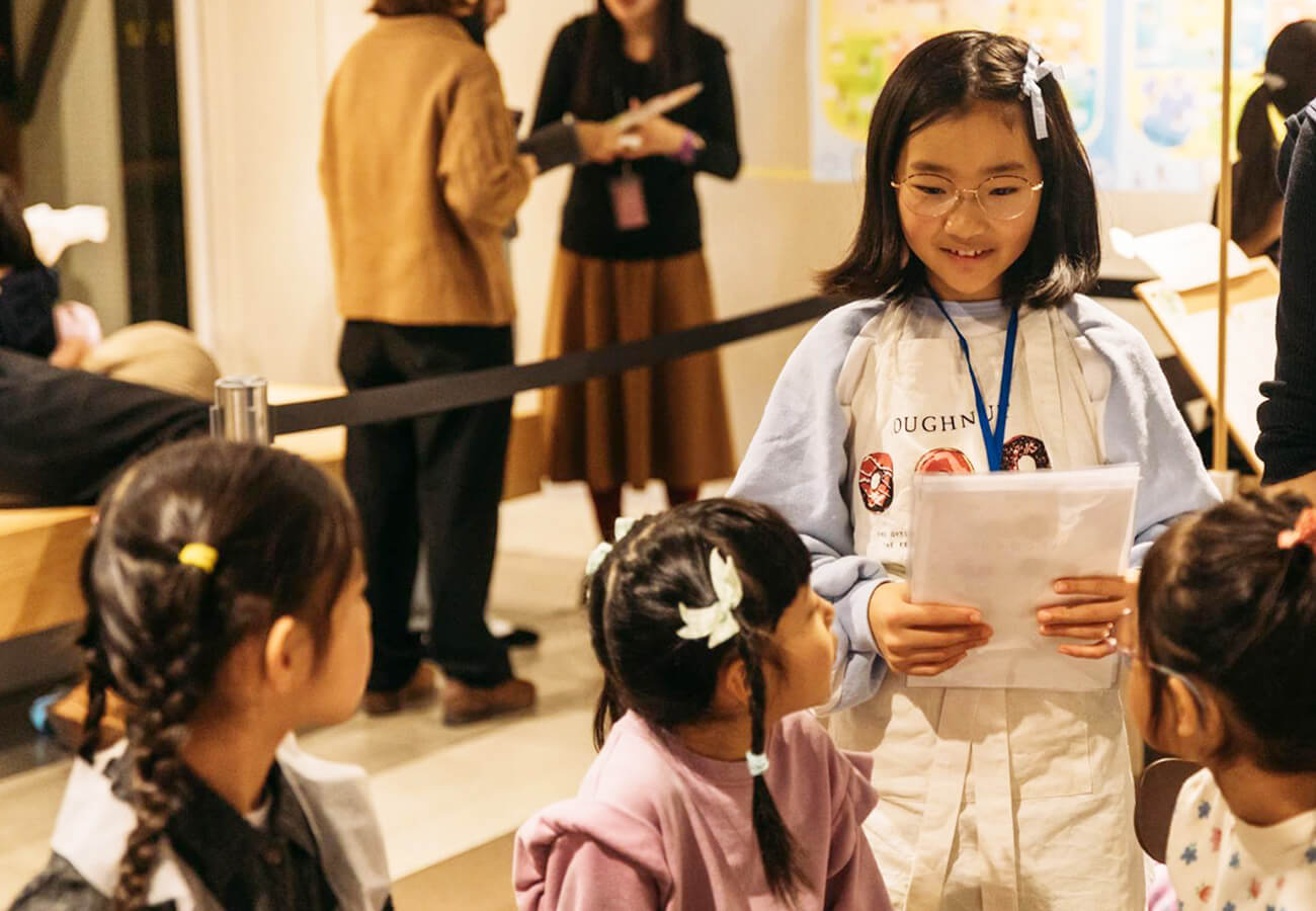 3ヶ月間の探求の成果を保護者や関係者に向けて発表します。子どもたちは自分のプロジェクトについてプレゼンテーションを行い、制作プロセスや学びを共有します。この場は、子どもたちが「夢中」を言語化し、他者に伝える大きな経験となるだけでなく、保護者が子どもの新たな一面を発見する機会にもなっています。