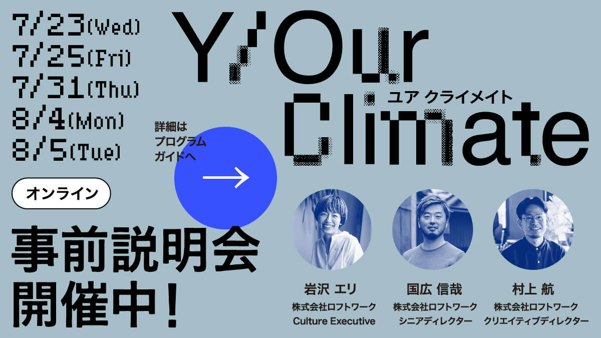Y/Our Climate(ユアクライメイト)のお申し込みはこちらです。改めて、プログラム概要、チケット概要、Q&Aなどを確認されたい方は、ウェブサイトをご覧ください。