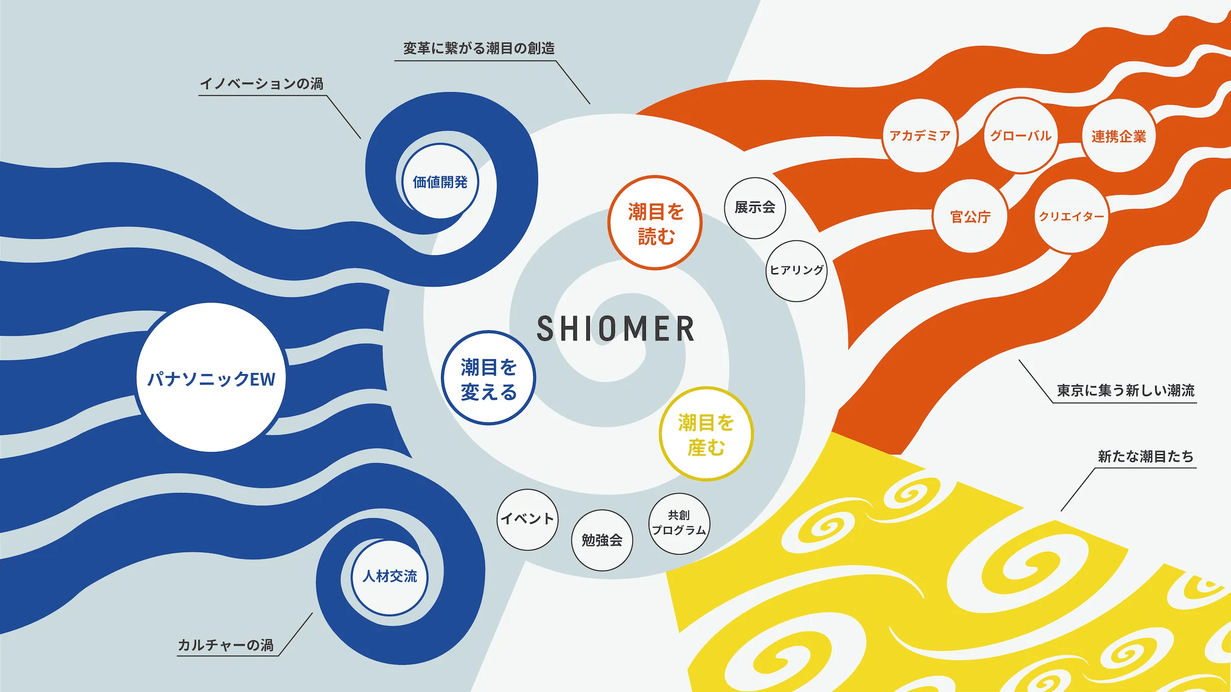 “「在東京設立全新的 R&D 據點時,我們與 Loftwork 組成了專案團隊並推進準備。如何將我們透過電器設備持續為生活點亮光明的 DNA,反映在據點的使命之中?這樣的思考結果,孕育出『點亮潮目』的概念,並進一步延伸為據點名稱 “SHIOMER”(潮目る)。