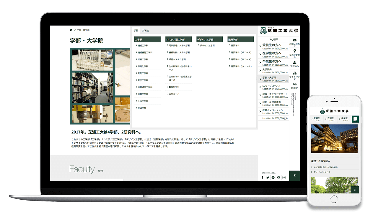 取代原本舊網站複雜且多重的訊息與不堪使用的後台系統,芝浦工業大期待表現「認真的」「真摯的」「堅忍的」之學校特質,在本次網站更新專案中更專注於手機與各種裝置的適應性,無論在功能與設計上,都得以升級。內容的設定上以工業大學的的技術研究為主,傳達其內斂卻腳踏實地的理工專業印象。